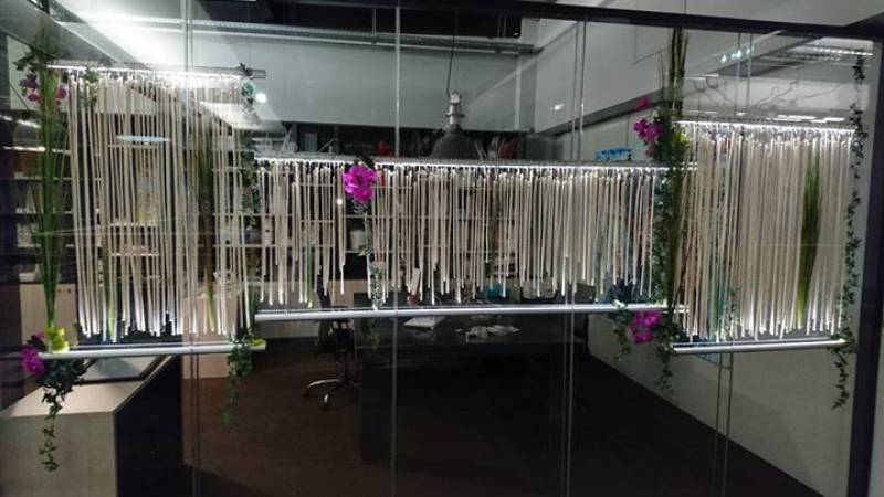 De l'art floral réalisé par ART HOME NATUREL, intégré entre les deux vitrages. Des fleurs de type orchidées, ainsi que du bambou viennent décorer la cloison,