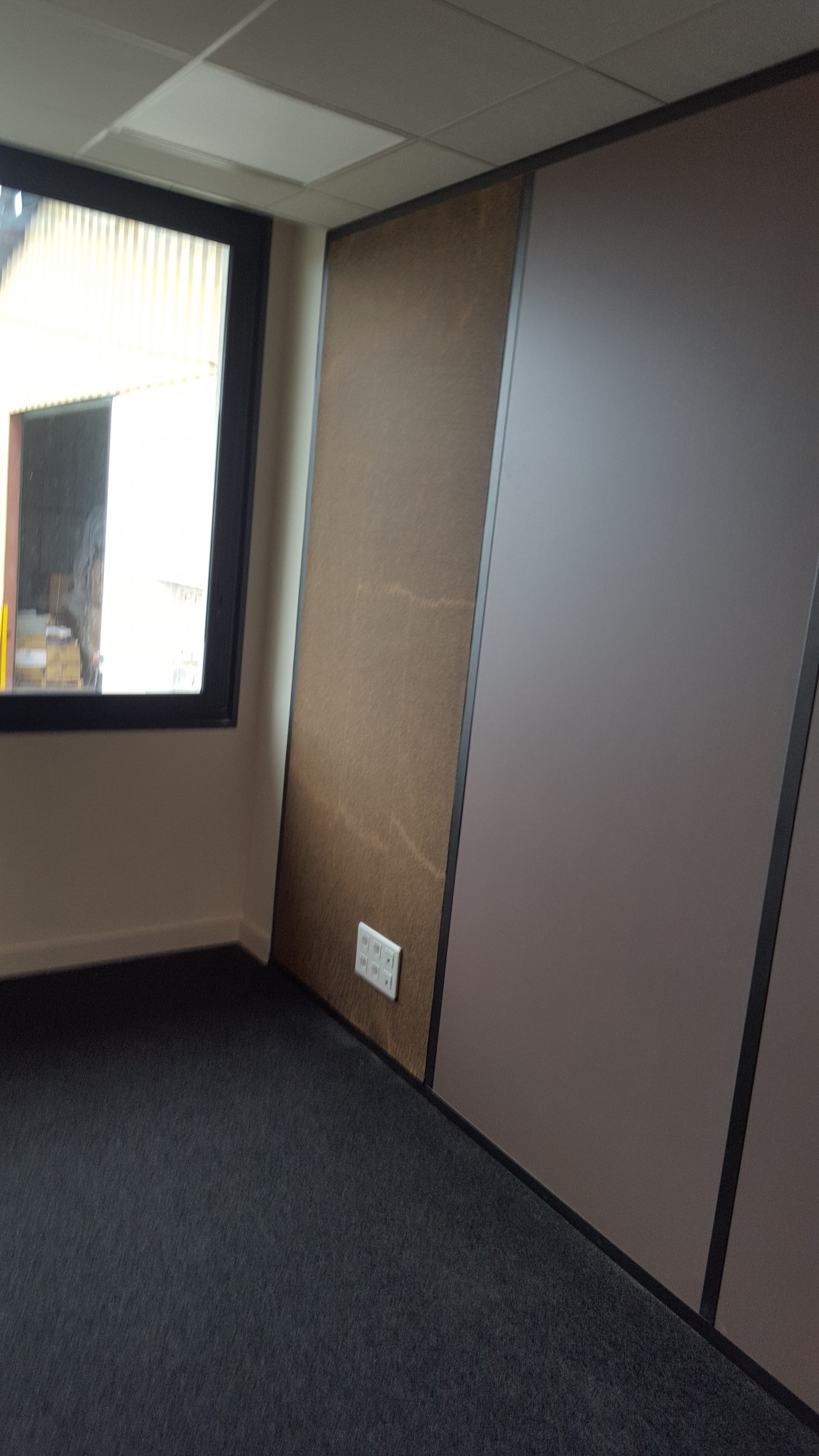 Des cloisons à ossature aluminium pleine, en remplissages de panneaux mélaminés de couleur marron;