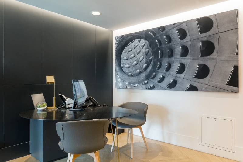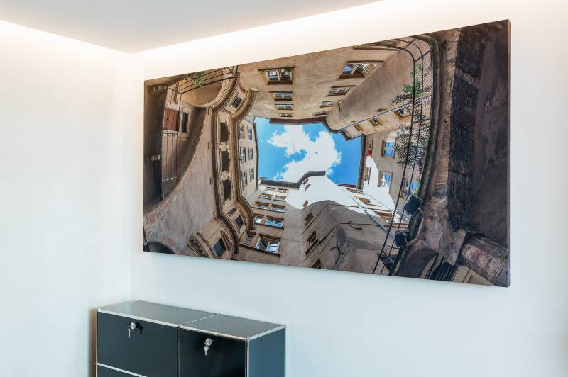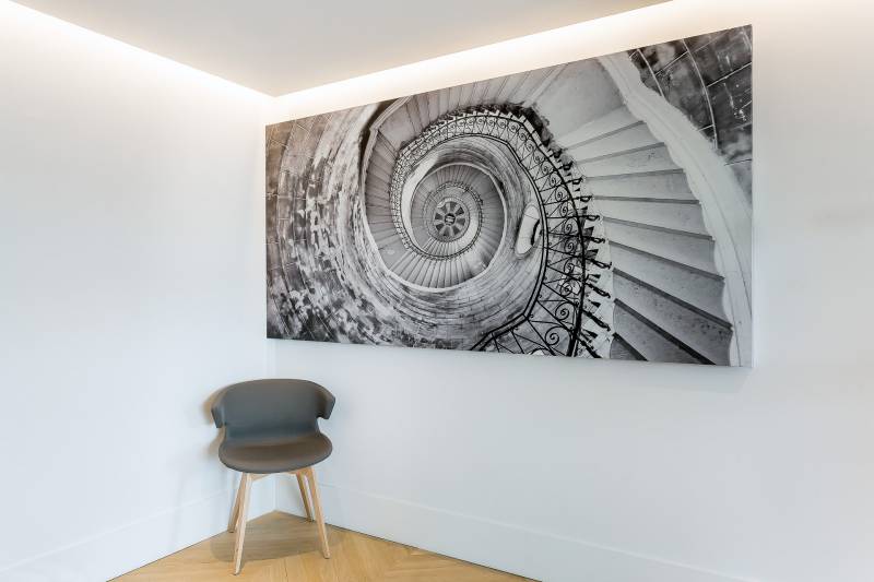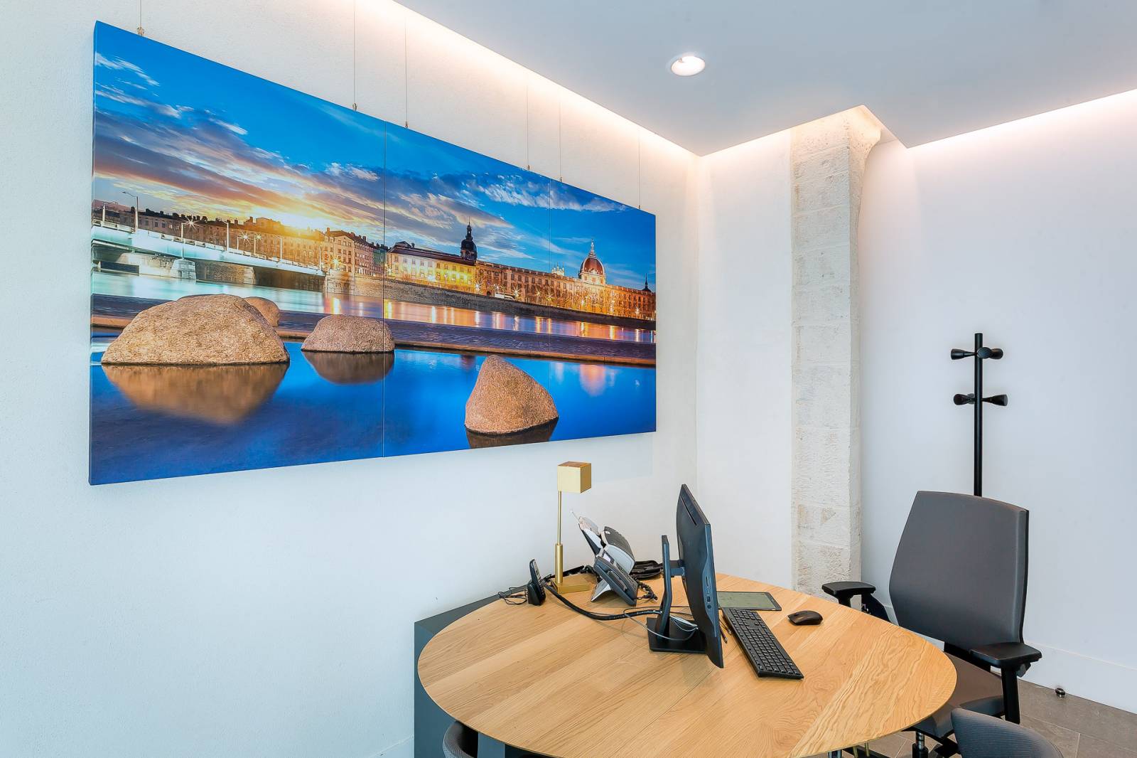 Dans les salles de réception nous avons mis en place des panneaux acoustiques imprimés, ils permettent de limiter la réverbération dans les salles et d’apporter de la décoration. Ici nos clients ont choisi d’imprimés des lieux culte de Lyon.