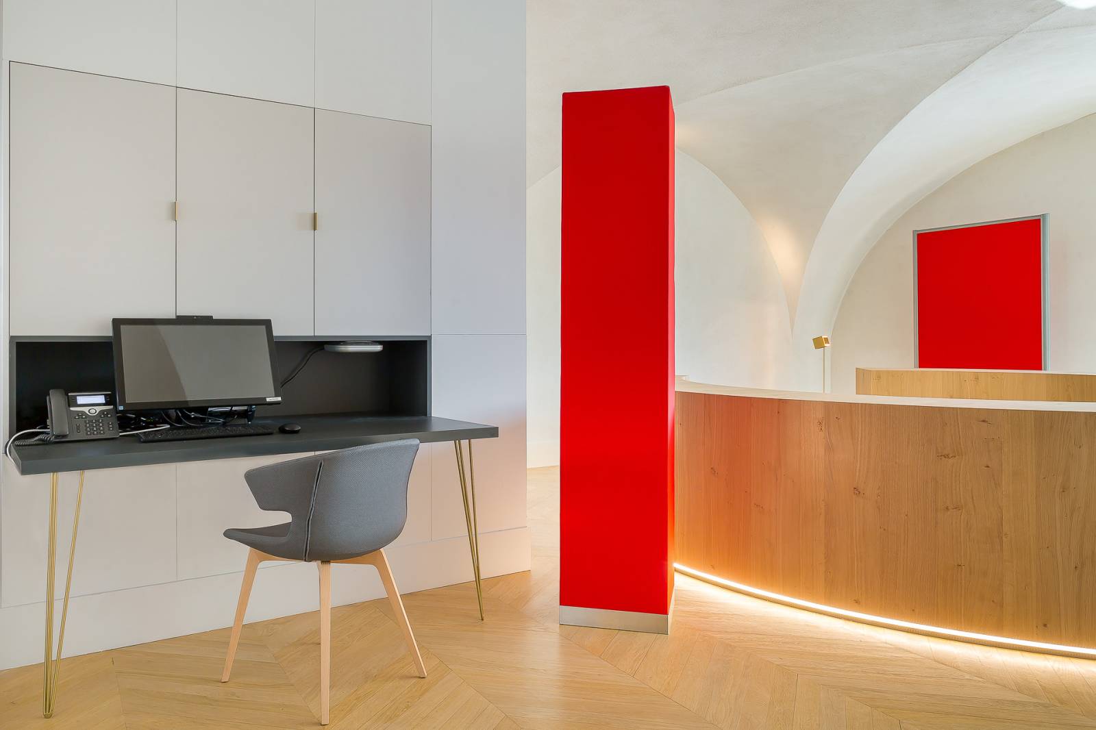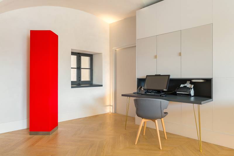 La première étape a été une étude acoustique des lieux. Dans cet espace, tout était réuni pour qu'il ait de la réverbération. Des murs en pierres, du vitrage, des cloisons vitrées, du carrelage. Les surfaces absorbantes telles que des tapis, étaient absents.