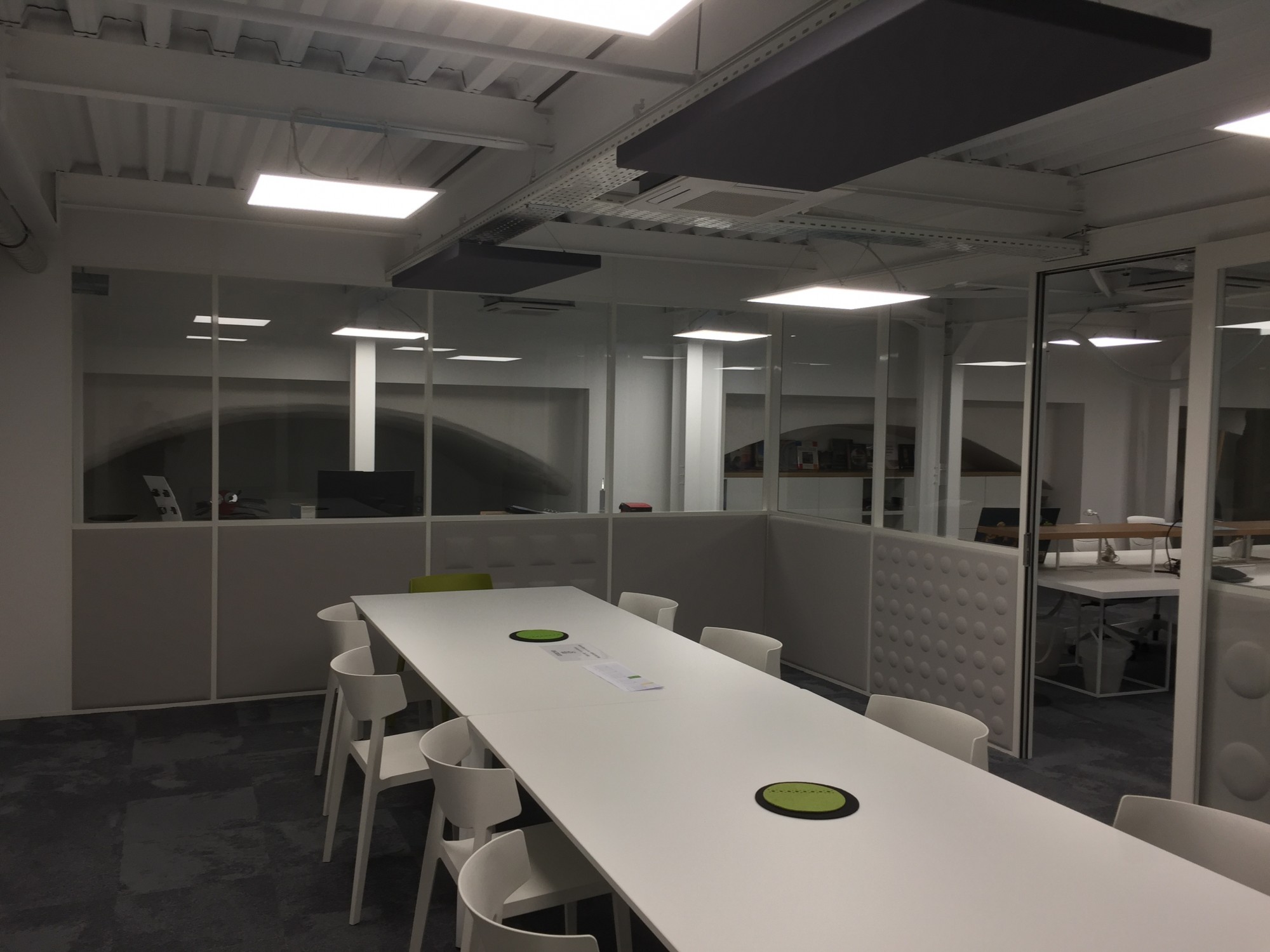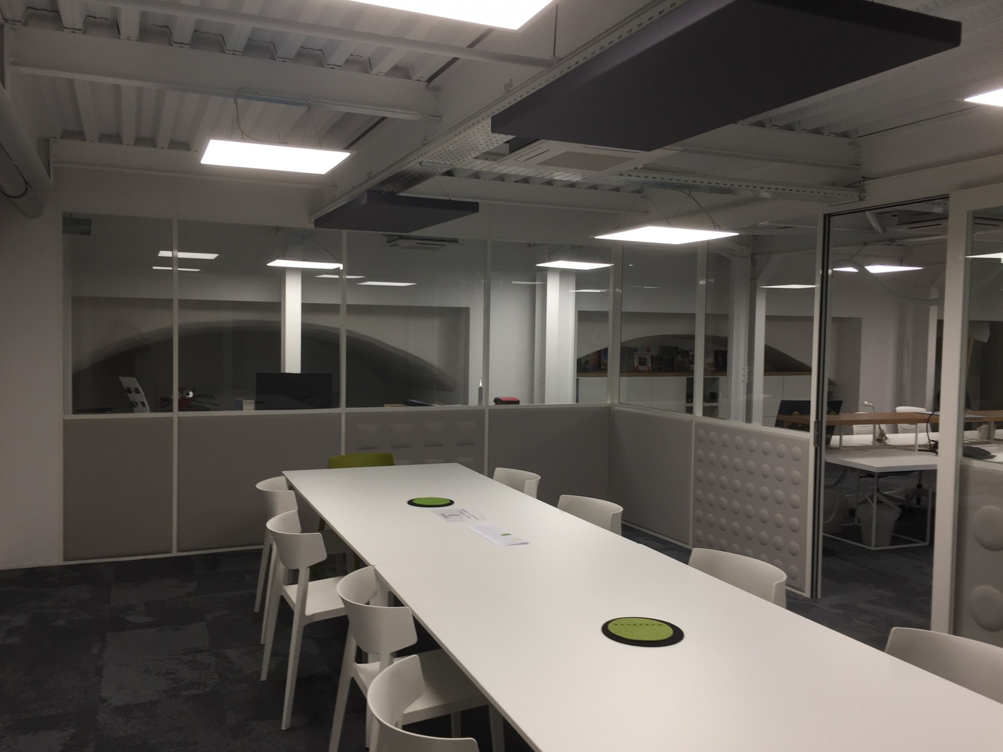Nous avons installé des panneaux acoustiques suspendus, juste au-dessus des bureaux pour absorber le bruit direct généré par les collaborateurs.
