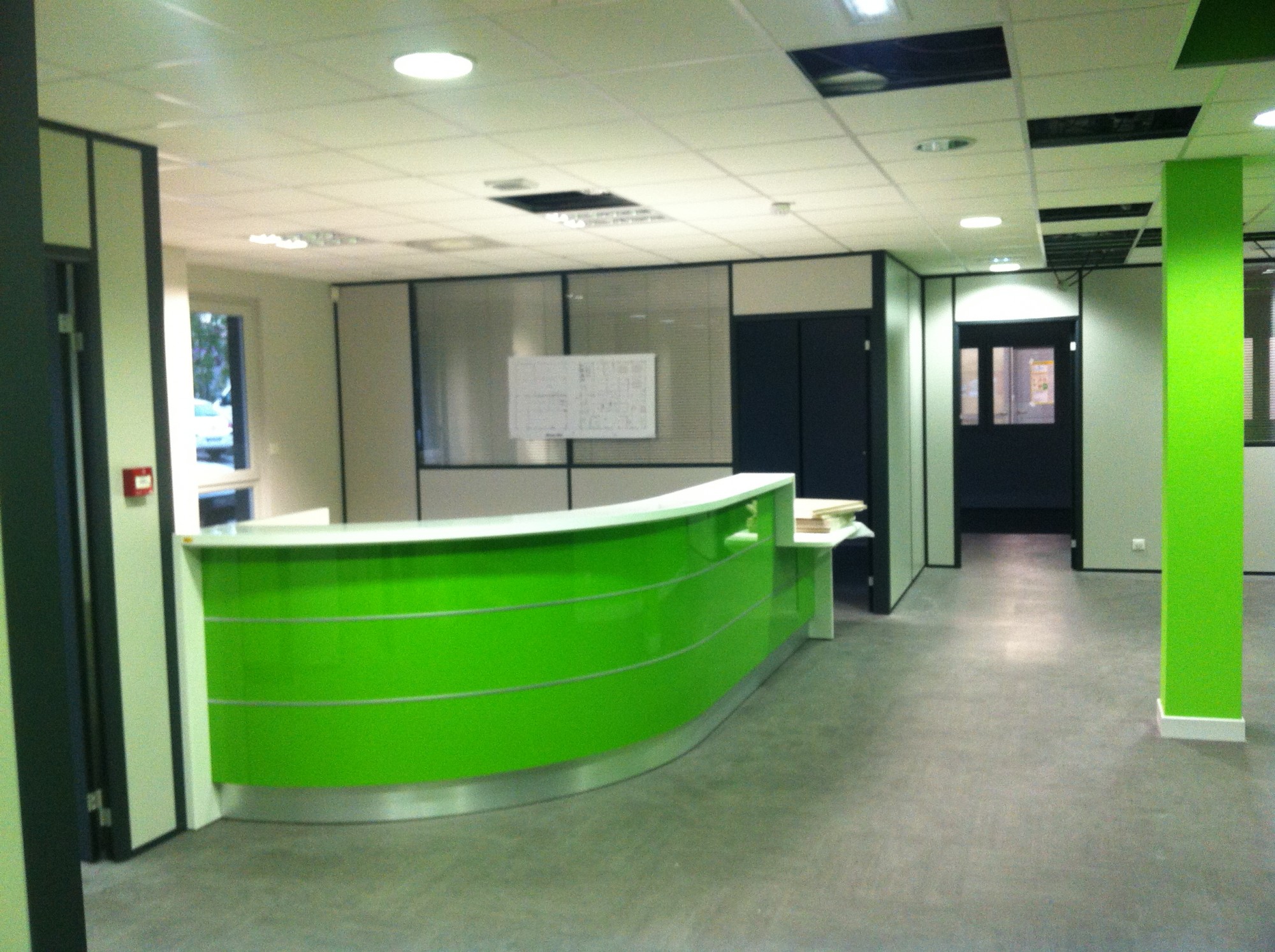 - Installation de cloisons H7 pleines coloris gris qui se marient parfaitement avec le vert flashy;