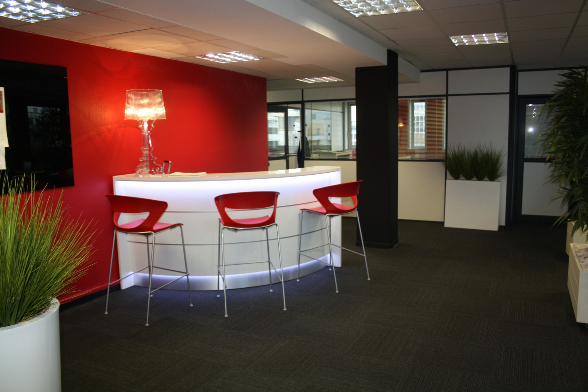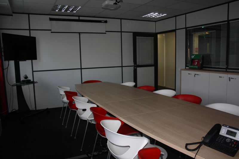 Dans les cloisons semi-vitrées nous avons intégré des stores entre le double vitrage. Cela a permis de créé de la confidentialité dans les salles de réunion.