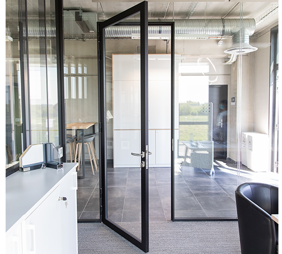 La cloison amovible en aluminium offre la possibilité d'intégrer différent type de porte, en finition vitrée semi-vitrée ou bois, chaque espace de travail doit être équipé d'une porte qui assure la confidentialité et la délimitation des espaces.