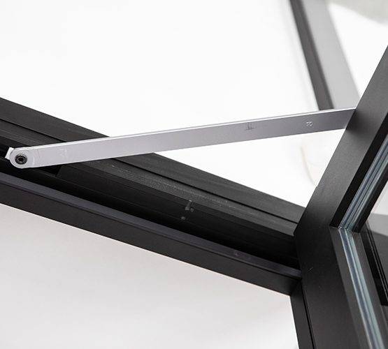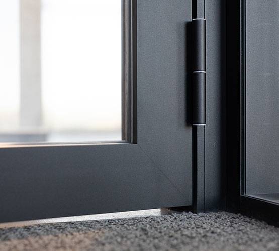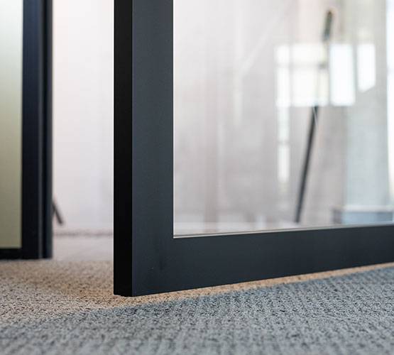 Montée en simple vitrage pris en portefeuille dans l’ossature, la porte Lineal s’affirme avec ses montants de 76 mm. Cette largeur de profil lui assure une parfaite rigidité sur les grandes hauteurs (jusqu’à 2950 mm) tout en gardant une ligne épurée.