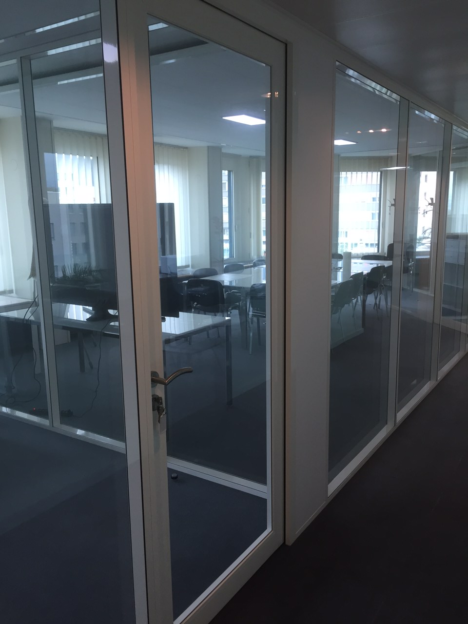 - Des cloisons vitrées toute hauteur en aluminium blanc,